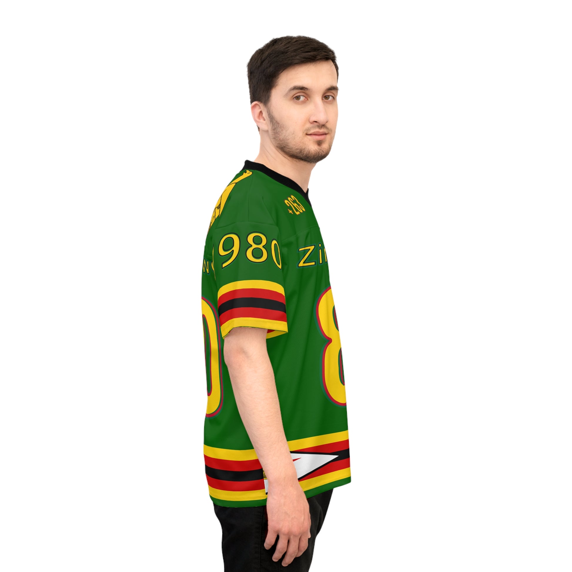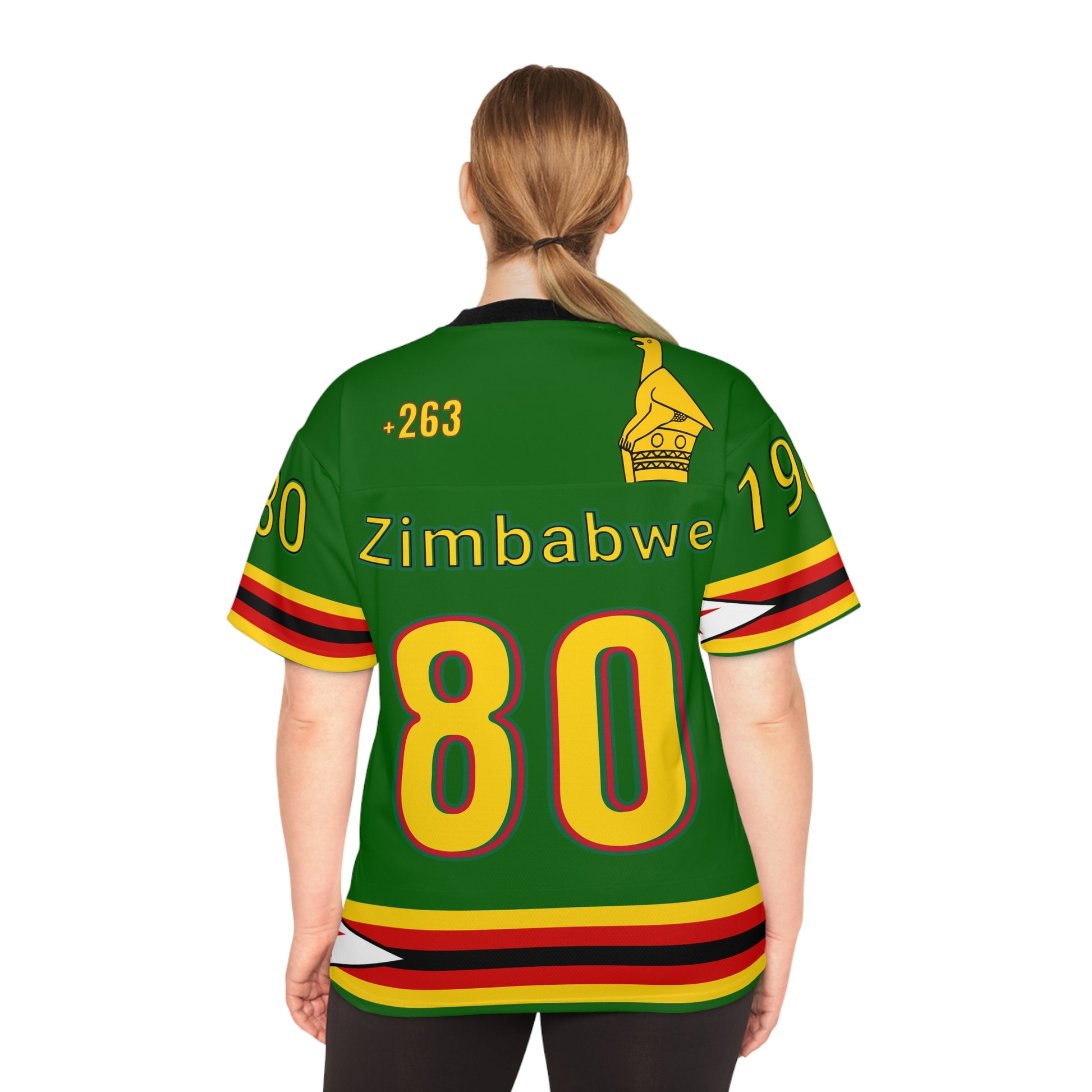 Above the name, the +263 country code and a miniature Zimbabwean flag mark identity and unity. The sleeves carry the symbolic number “1980”, alongside the iconic Zimbabwe Bird, a national emblem of resilience and heritage. Horizontal flag-colored stripes wrap the sleeves and hem, grounding the design in cultural depth. Whether you're repping Zim in the diaspora or celebrating at home, this jersey lets you carry your roots with pride— MaZimbos , to the world.