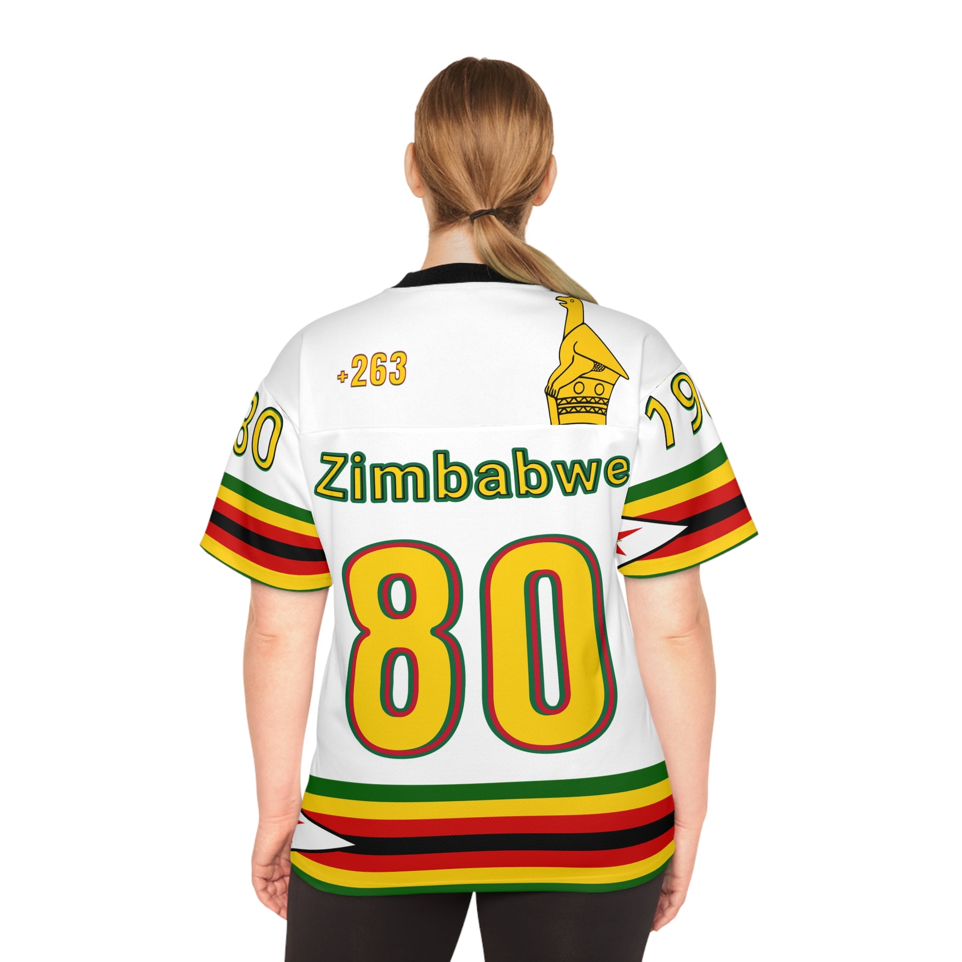 Above the name, the +263 country code and a miniature Zimbabwean flag mark identity and unity. The sleeves carry the symbolic number “1980”, alongside the iconic Zimbabwe Bird, a national emblem of resilience and heritage. Horizontal flag-colored stripes wrap the sleeves and hem, grounding the design in cultural depth. Whether you're repping Zim in the diaspora or celebrating at home, this jersey lets you carry your roots with pride— MaZimbos , to the world.